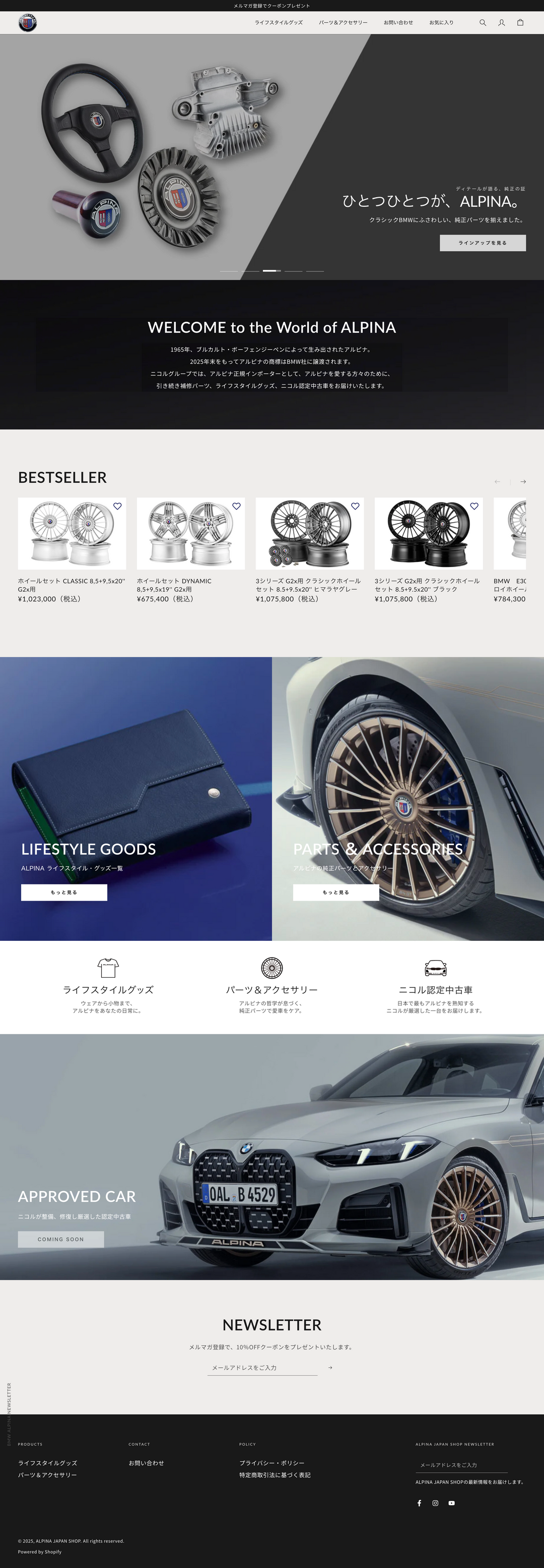「ALPINA JAPAN SHOP」は2025年が特別な節目の年となり、ALPINAというブランドが持つ世界観や感動を引き続きお届けするために、ShopifyにてALPINAオンラインショップを開設いたしました。