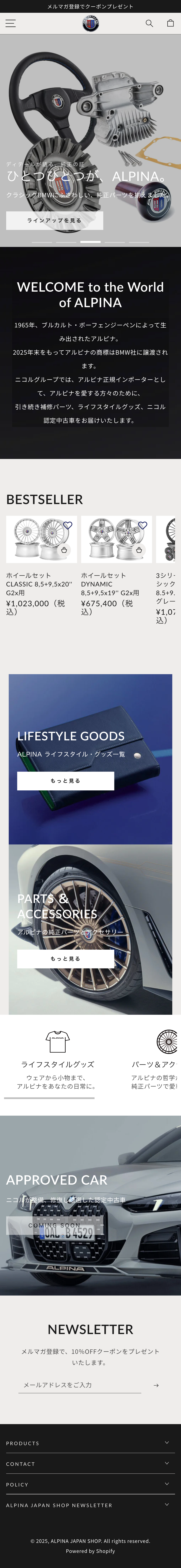 「ALPINA JAPAN SHOP」は、独国アルピナ社日本総代理店 ニコル・オートモビルズ合同会社が展開するECサイトです。アルピナ正規インポーターとして、アルピナを愛する方々のために、補修パーツ、ライフスタイルグッズ、ニコル認定中古車をお届けいたします。