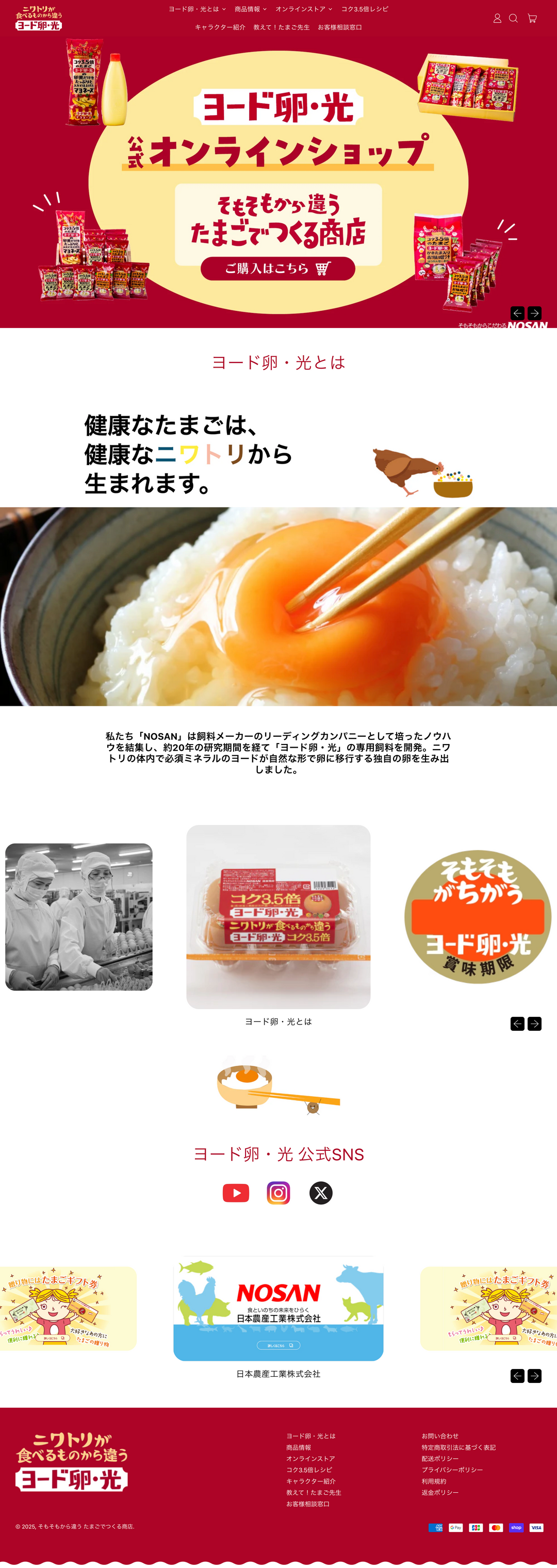 ヨード卵・光は、2026年に販売50周年を迎える日本初のブランド卵*¹。一般的なたまごと比べ3.5倍ものコクが特徴です*²。サイトではヨード卵・光を初めとした鶏卵を使用した商品を展開しています。