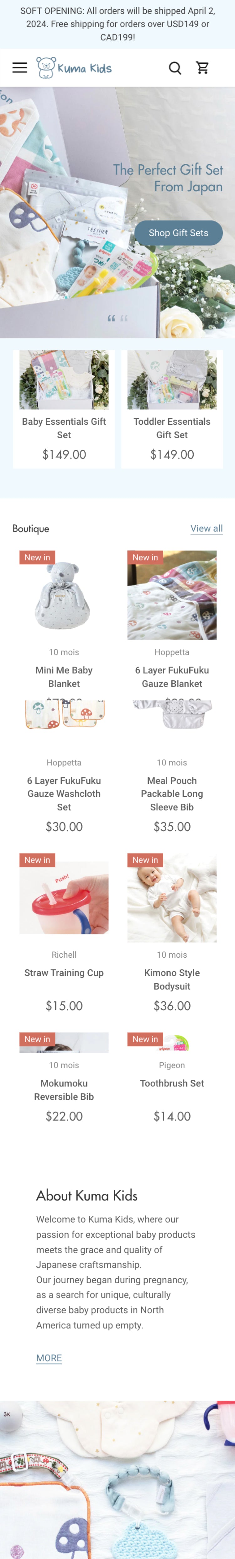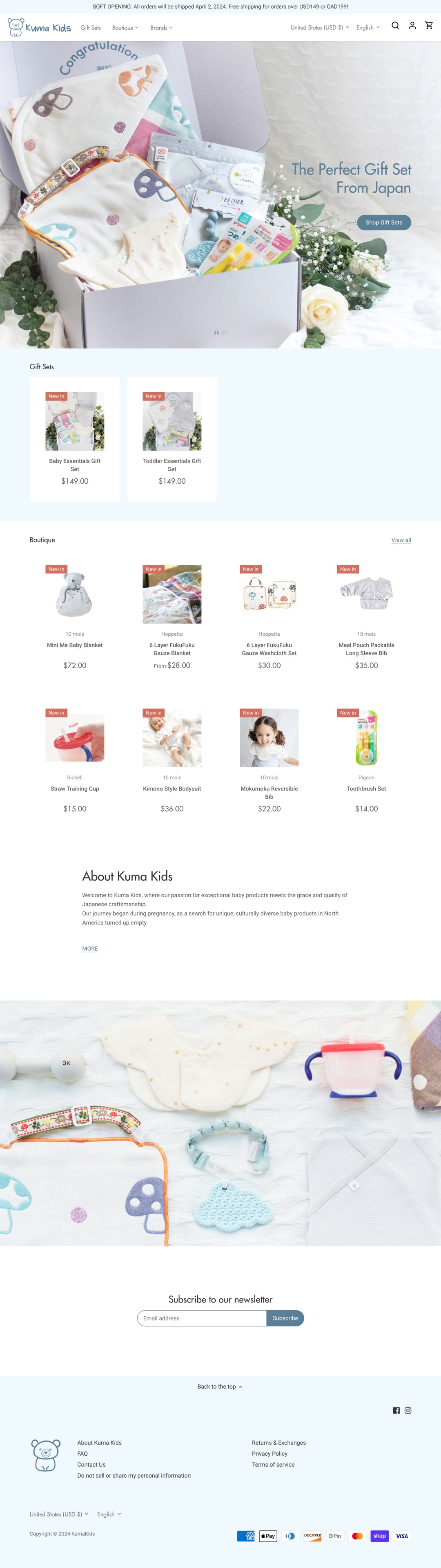 "Kuma Kids" is a specialty baby goods store that offers gift boxes filled with high-quality Japanese baby products, now available for sale in North America. This is a cross-border e-commerce project from Japan to Canada and the United States.